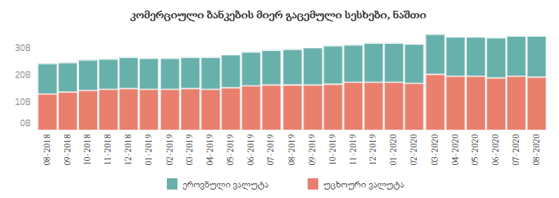 ამავე პერიოდში, ეროვნული ვალუტით გაცემული სესხების მოცულობა 191.06 მლნ ლარით (1.30%-ით) გაიზარდა, ხოლო უცხოური ვალუტით გაცემული სესხების მოცულობა 192.99 მლნ ლარით (0.98%-ით) შემცირდა (გაცვლითი კურსის ეფექტის გარეშე, შემცირდა 1.13%-ით).