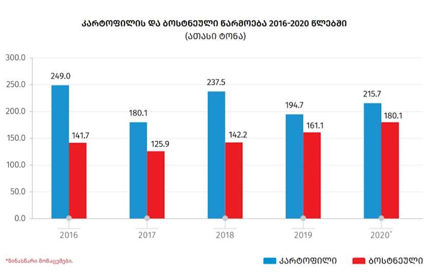 სიმინდის წარმოება 263.0 ათასი ტონით განისაზღვრა, რაც 27.0 პროცენტით მეტია წინა წლის შესაბამის მაჩვენებელზე. კარტოფილის წარმოება 10.8 პროცენტით გაიზარდა და 215.7 ათასი ტონა შეადგინა. ამასთან, 2020 წლის განმავლობაში წარმოებულია 180.1 ათასი ტონა ბოსტნეული, რაც 11.8 პროცენტით აღემატება წინა წლის შესაბამის მაჩვენებელს.