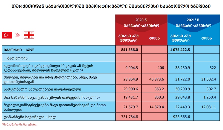 საქართველოს უმსხვილესი საიმპორტო ქვეყნების სიაში თურქეთი ლიდერობს