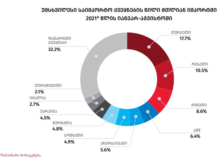 2021 წლის იანვარ-აგვისტოში ათი უმსხვილესი საიმპორტო პარტნიორი ქვეყნის წილმა საქართველოს მთლიან იმპორტში 67.8% შეადგინა. პირველ სამეულში შედის: თურქეთი (1 075.4 მლნ. აშშ დოლარი), რუსეთი (634.8 მლნ. აშშ დოლარი) და ჩინეთი (519.5 მლნ. აშშ დოლარი).