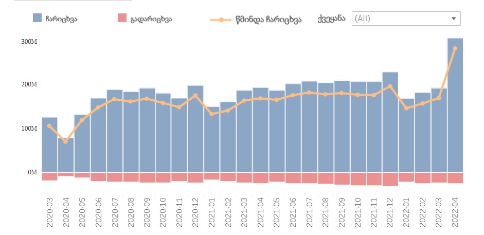 2022 წლის აპრილში საქართველოდან საზღვარგარეთ 25.4 მლნ აშშ დოლარი (77.8 მლნ ლარი) გადაიგზავნა, რაც 2021 წლის აპრილის (25.8 მლნ აშშ დოლარი) ანალოგიურ მაჩვენებელთან შედარებით 1.5%-ით ნაკლებია.