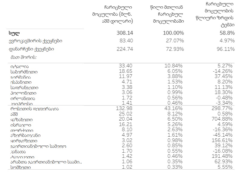 უცხოეთიდან საქართველოში ფულადი გზავნილების 96.2% იმ 20 უმსხვილეს პარტნიორ ქვეყანაზე მოდის, საიდანაც გზავნილების მოცულობა აპრილში თითოეულზე 1 მლნ აშშ დოლარს აღემატებოდა. იმავე 20 ქვეყანაზე გასული წლის აპრილში მთელი ფულადი გზავნილების 91.5% მოდიოდა.