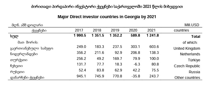 „საქსტატი“: 2021 წელს საქართველოში განხორციელებული პირდაპირი უცხოური ინვესტიციების მოცულობა გაიზარდა - ინვესტორი ქვეყნებიდან პირველ ადგილზე გაერთიანებული სამეფოა