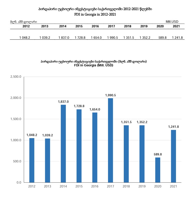 საქართველოს სტატისტიკის ეროვნული სამსახურის ინფორმაციით, 2021 წელს, საქართველოში პირდაპირი უცხოური ინვესტიციების მოცულობამ 1,241,8 მლნ. აშშ დოლარი შეადგინა, რაც 2020 წლის მაჩვენებელს (589.8 მლნ. აშშ დოლარი) მკვეთრად აჭარბებს.