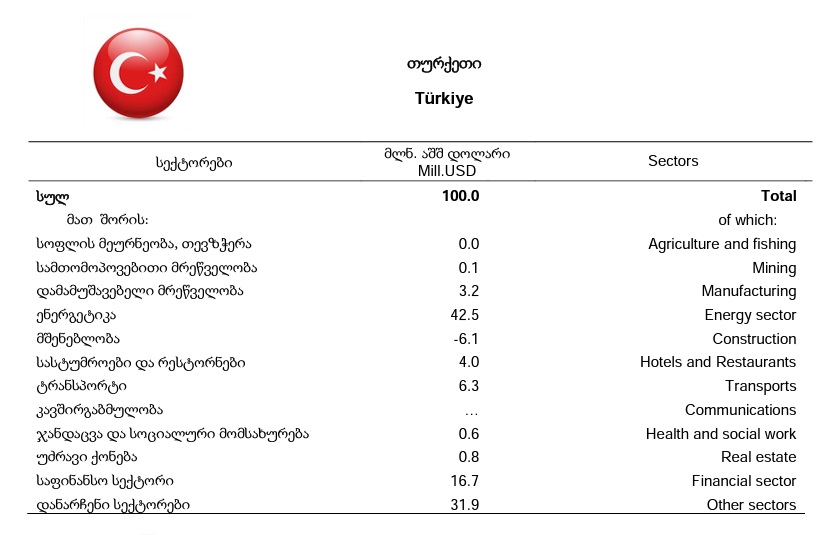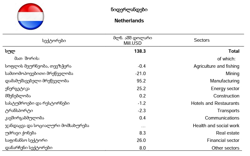 ძირითადი პირდაპირი ინვესტიციებით, ლიდერი ქვეყნებია: გაერთიანებული სამეფო, ნიდერლანდები და თურქეთი.