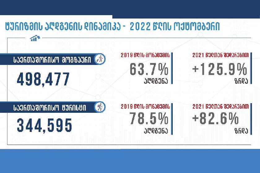 2022 წლის ოქტომბერში საქართველოში 344,595 საერთაშორისო ტურისტული ვიზიტი შედგა, ზრდა 2021 წლის ანალოგიურ პერიოდთან შედარებით +82.6%-ს შეადგენს. 2019 წლის ანალოგიურ პერიოდთან შედარებით საერთაშორისო ტურისტული ვიზიტების 78.5% აღდგენილია.