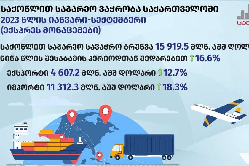 საქსტატის ცნობით, ექსპორტი წინა წლის ანალოგიურ პერიოდთან შედარებით 12,7%-ით, ხოლო იმპორტი 18,3%-ით მეტია. კერძოდ, იანვარ-სექტემბერში საქართველოში საქონლით საგარეო სავაჭრო ბრუნვამ (არადეკლარირებული ვაჭრობის გარეშე) 15 919.5 მლნ. აშშ დოლარი შეადგინა, რაც წინა წლის შესაბამის მაჩვენებელზე 16.6 პროცენტით მეტია. აქედან, ექსპორტი 4 607.2 მლნ. აშშ დოლარი იყო (გაიზარდა 12.7 პროცენტით), ხოლო იმპორტი 11 312.3 მლნ. აშშ დოლარი (გაიზარდა 18.3 პროცენტით). უარყოფითმა სავაჭრო ბალანსმა 2023 წლის იანვარ-სექტემბერში 6 705.1 მლნ. აშშ დოლარი შეადგინა, რაც საგარეო სავაჭრო ბრუნვის 42.1 პროცენტია.
