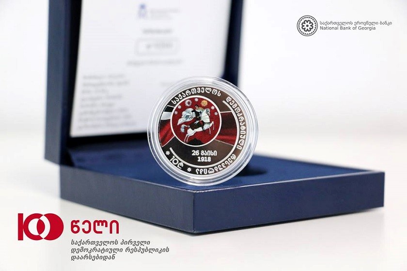 საქართველოს პირველი დემოკრატიული რესპუბლიკის დაარსებიდან 100 წლის იუბილესადმი მიძღვნილ 10-ლარის ნომინალის ვერცხლის საკოლექციო მონეტა ეროვნული ბანკის პრეზიდენტმა კობა გვენეტაძემ საზოგადოებას წარუდგინა.