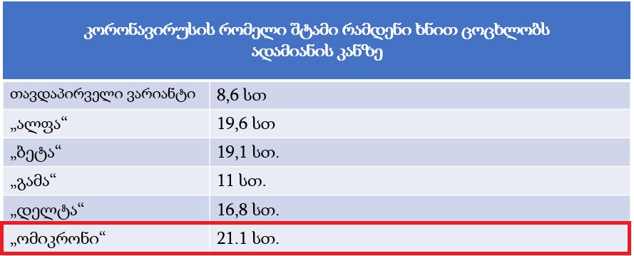რაც შეეხება ადამიანის კანზე კორონავირუსის ვარიანტების სიცოცხლის ხანგრძლივობას: თავდაპირველი, უჰანიდან გავრცელებული შტამის შემთხვევაში ის 8,6 სთ. იყო, „ალფას“ შემთხვევაში 19,6 სთ, „ბეტა“ შტამი კანზე 19,1 სთ. რჩებოდა, „გამა“ - 11 სთ., „დელტა“ - 16,8 სთ., ხოლო ადამიანის კანზე „ომიკრონის“ სიცოცხლისუნარიანობის ხანგრძლივობა 21,1 საათია.