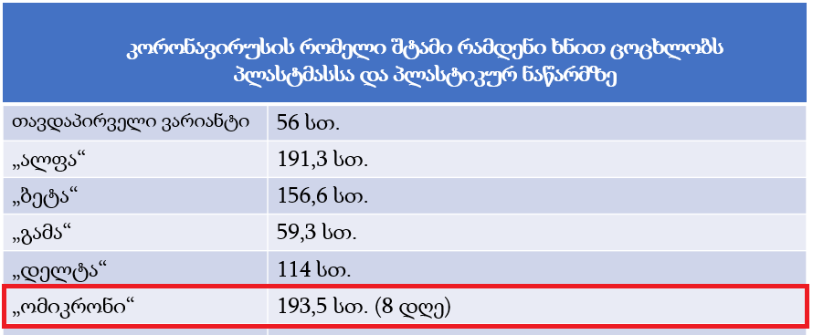 მაგალითისთვის, თუ პლასტმასისა და პლასტიკური ნაწარმის ზედაპირზე უჰანიდან გავრცელებული ვარიანტი 56 სთ., „ალფა“ 191,3 სთ., „ბეტა“ 156,6 სთ., „გამა“ 59,3 სთ., ხოლო „დელტა“ ვარიაცია 114 სთ. ცოცხლობდა, „ომიკრონის“ შემთხვევაში, ვირუსის სიცოცხლისუნარიანობა 193,5 საათს აღწევს, რაც 8 დღეს უდრის.