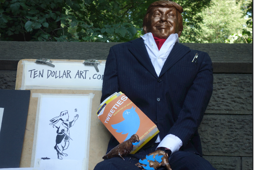 მანჰეტენზე დაიდგა ტრამპის ძეგლი, რომელიც საკუთარ Twitt-ებს მიირთმევს