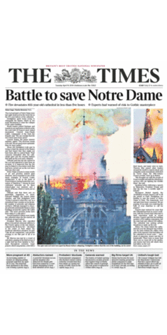 „საერთაშორისო დრამის მასშტაბი გამოცემების პირველ გვერდზე გამოქვეყნებული ფოტოებით იზომება. ეს ფოტოები ისტორიას ასახავს. მთელი მსოფლიოს გამოცემების პირველ გვერდებზე ცეცხლის ალში გახვეული ნოტრ-დამის ტაძარია. ყველაზე ხშირად გხვდება სათაური „ჩვენი დრამა“ (Notre Drame), რომელიც პირველმა გამოცემა Libération-მა გამოიყენა.