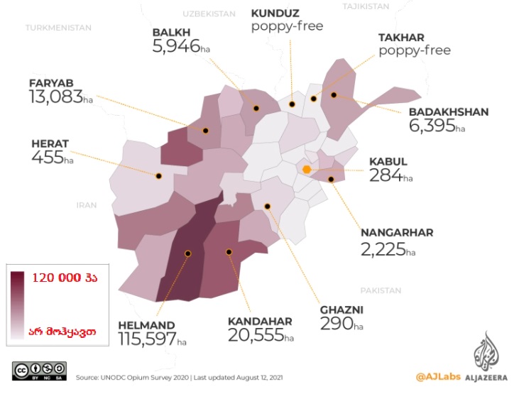 ავღანეთი მსოფლიოში პირველ ადგილზეა ოპიუმის ყაყაჩოს კულტივაციის თვალსაზრისით. მისგან კი, ჰეროინი მზადდება. 2020 წლის მონაცემებით, ქვეყანაში 224 ათას ჰექტარზე მოჰყავთ ოპიუმის ყაყაჩო. ამ ფართობის ნახევარზე მეტი, 115 597 ჰექტარი მხოლოდ ჰელმანდის პროვინციაზე მოდის. გასულ წელს 6 300 ტონამდე ოპიუმის ყაყაჩო აწარმოეს, რომლის ღირებულებამაც $350 მილიონი შეადგინა.