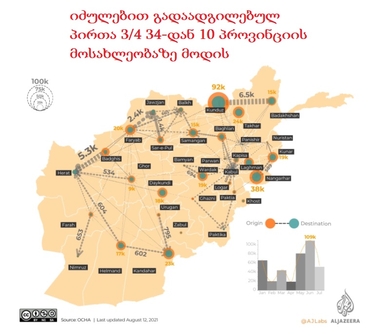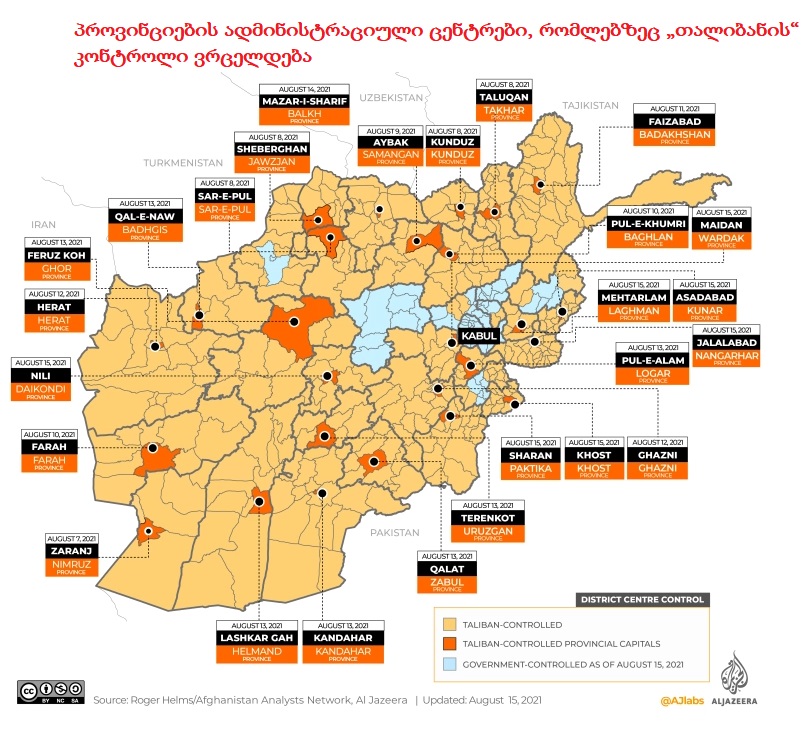 ბოლო რამდენიმე დღის განმავლობაში, „თალიბანმა“ ავღანეთის 34 პროვინციის 26 ადმინისტრაციული ცენტრი აიღო. შეიარაღებული ჯგუფი ახლა ქვეყნის ტერიტორიის დაახლოებით 65%-ს აკონტროლებს.