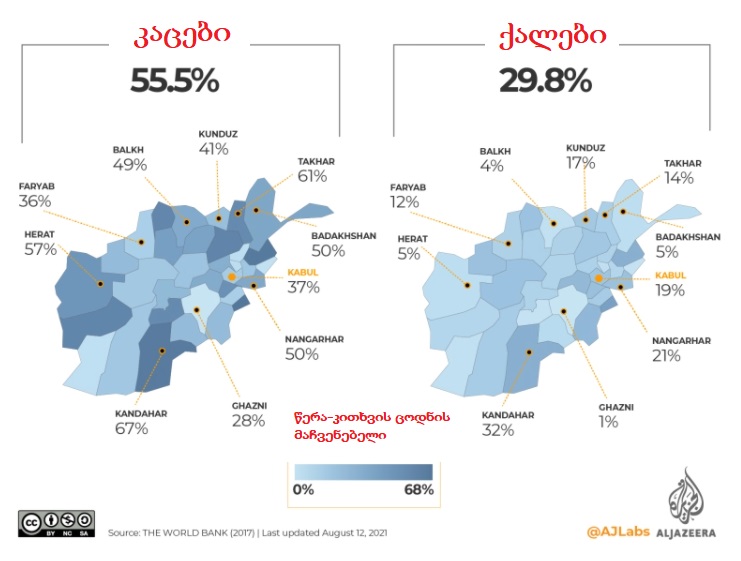 ათწლეულების განმავლობაში, დამანგრეველი ომების შედეგად, ავღანეთში წიგნიერების დონე მსოფლიოში ერთ-ერთი ყველაზე დაბალ მაჩვენებელზეა და 43%-ს შეადგენს. 15 წელზე უფროსი ასაკის მამაკაცების ნახევარზე მეტს შეუძლია წერა და კითხვა, ხოლო ქალებში ეს მაჩვენებელი გაცილებით დაბალი, 1/3-ზე ნაკლებია.