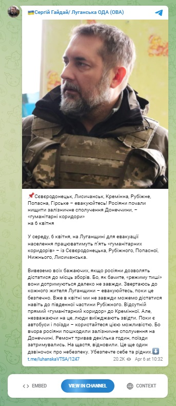 „ყველას გამოვიყვანთ, თუ რუსები მოგვცემენ საშუალებას, მოსახლეობა ევაკუაციისთვის დათქმულ შეკრების ადგილებზე შეიკრიბოს. როგორც ხედავთ, ისინი ყოველთვის არ ასრულებენ ცეცხლის შეწყვეტის შესახებ შეთანხმებებს. მივმართავ ლუგანსკის რეგიონის ყველა მცხოვრებს - ევაკუაცია მოახდინოს, ვიდრე ეს უსაფრთხოა... სანამ არის ავტობუსები და მატარებლები - ისარგებლეთ ამ შესაძლებლობით“, - წერს ლუგანსკის რეგიონის გუბერნატორი, სერგეი ჰაიდაი Telegram-ზე.