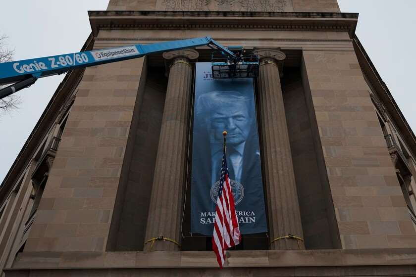 ხუთშაბათს, ვაშინგტონში, იუსტიციის დეპარტამენტის ფასადზე დონალდ ტრამპის დიდი ბანერი გადმოჰკიდეს.