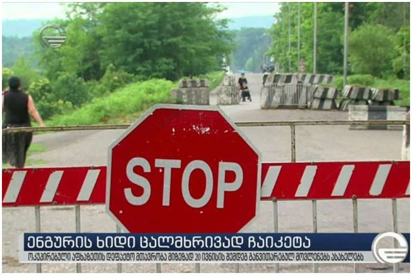 აფხაზეთის დე ფაქტო ხელისუფლებამ ენგურის ხიდზე 27 ივნისს 20:00 საათიდან მოძრაობა ცალმხრივად ჩაკეტა. აფხაზეთიდან ზუგდიდში არ გაატარებენ ადამიანებს, ოკუპირებულ აფხაზეთში გადასვლის უფლება კი ექნებათ ე.წ. აფხაზური პასპორტების ან მიწვევის მქონე ადამიანებს.