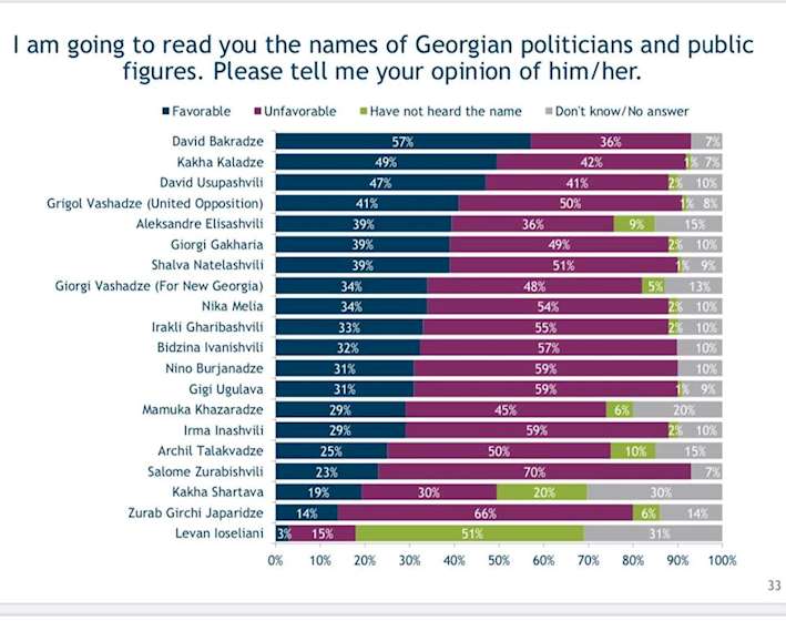 საქართველოს პრეზიდენტი სიაში მეჩვიდმეტეა: დადებითი - 23%, უარყოფითი - 70%, არ ვიცი - 7%.