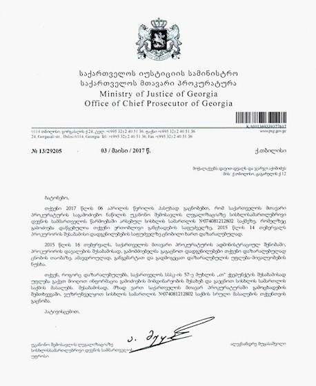 მთავარი საგამოძიებო უწყების სახელით გაგზავნილ წერილს პროკურორი ალექსანდრე მუყასაშვილი აწერს ხელს, რომელიც უკანონო შემოსავლის ლეგალიზაციაზე სისხლისსამართლებრივი დევნის სამმართველოს ხელმძღვანელობს.