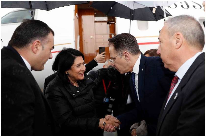 საქართველოს პრეზიდენტს აეროპორტში დახვდნენ: ისრაელის მთავრობის მდივანი ცახი ბრავერმანი, სოციალურ საქმეთა მინისტრი გილა გამლიელი, საგარეო საქმეთა სამინისტროს გენერალური დირექტორი  იუვალ როტემი, ისრაელის სახელმწიფო პროტოკოლის ხელმძღვანელი მერონ რეუვენი, საქართველოს ელჩი ისრაელის სახელმწიფოში ლაშა ჟვანია.