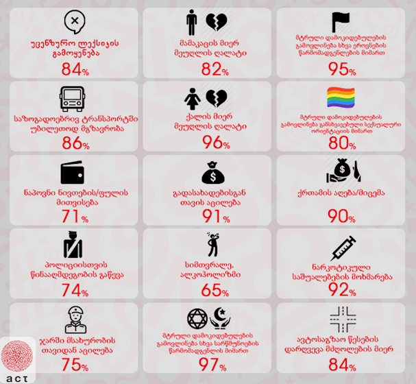 კვლევითი ორგანიზაცია ACT Global-ი დაინტერესდა თუ რა დამოკიდებულება აქვთ თბილისში მცხოვრებლებს არანორმატიული და უკანონო ქმედებების ჩადენის მიმართ და ამ თემაზე კვლევა ჩაატარა. კვლევით აღმოჩნდა, რომ თბილისის მოსახლეობა ამ ტიპის საქციელის მიმართ შეუმწყნარებლობის მაღალი ხარისხით ხასიათდება.