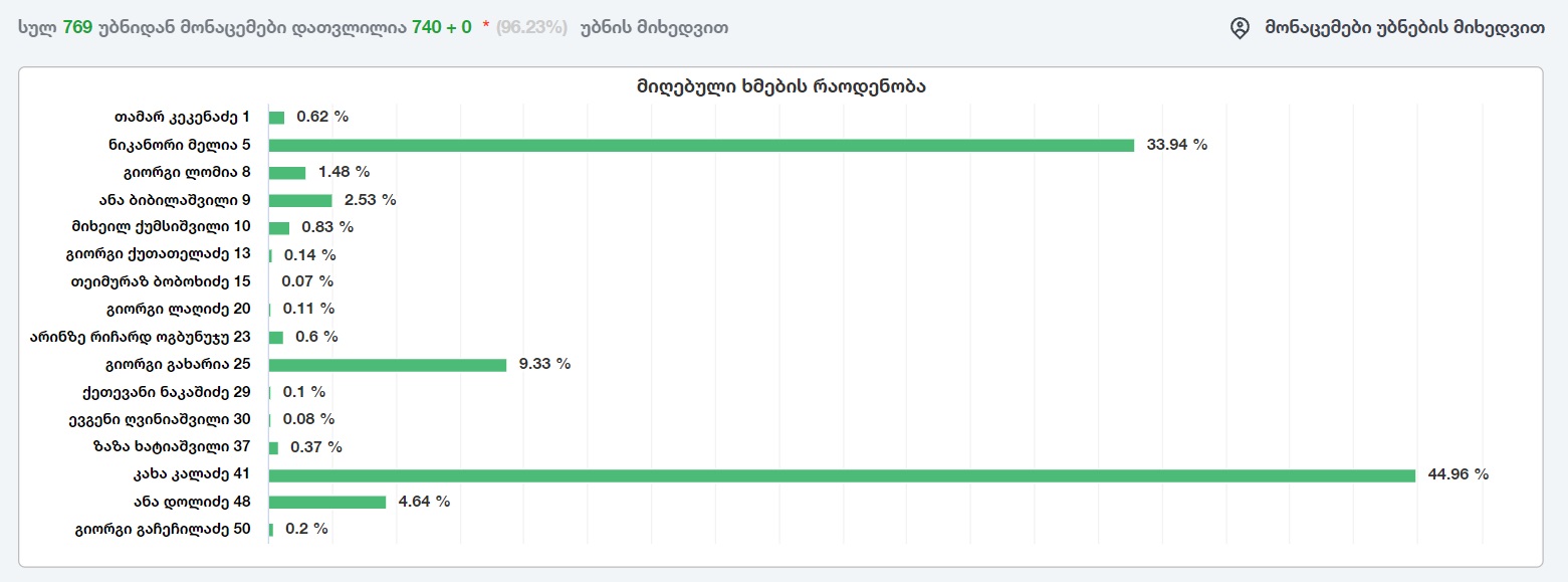 ცესკომ საზოგადოებას ადგილობრივი თვითმმართველობის არჩევნების განახლებული წინასწარი შედეგები გააცნო. ცენტრალური საარჩევნო კომისიის მიერ, ამ დროისთვის, თბილისის 769 საარჩევნო უბნიდან ხმები დათვლილია 740 უბანზე (ოქმების 96,23%), ოფიციალური მონაცემების მიხედვით, ხმები შემდეგნაირად გადანაწილდა: