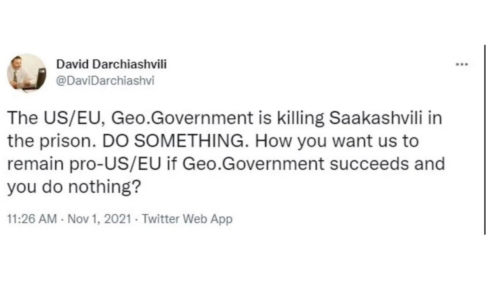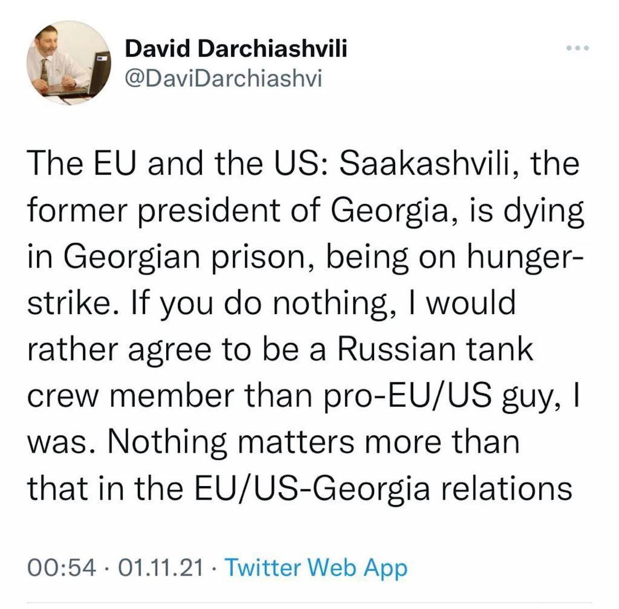 იქამდე, ის წერდა: „საქართველოს ყოფილი პრეზიდენტი კვდება ქართულ ციხეში, ის შიმშილობს. თუ არაფერს გააკეთებთ, მირჩევნია, ვიყო რუსული სატანკო ეკიპაჟის წევრი, ვიდრე პროევროპელი და პროამერიკელი, როგორც ვიყავი აქამდე. საქართველოს ევროკავშირთან და აშშ-სთან ურთიერთობაში ამაზე მნიშვნელოვანი არაფერია“.