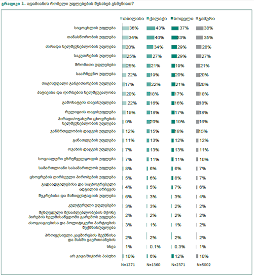 კვლევის მიხედვით, ყოველი 10 გამოკითხულიდან მხოლოდ ერთმა (10%) აღნიშნა, რომ ადამიანის კონკრეტული უფლებების შესახებ ლაპარაკი უჭირს, სხვებმა კი, სულ ცოტა, ერთი ასეთი უფლება დაასახელეს. კვლევამ აჩვენა, რომ ადამიანის უფლებებზე საუბრისას გამოკითხულებს ყველაზე ხშირად სიცოცხლის (38%) და თანასწორობის (35%) უფლებები ახსენდებათ (ამ მხრივ, ერთნაირი სიტუაციაა თბილისსა და სხვა ქალაქსა თუ სოფლებში).