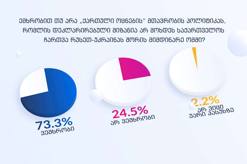 GORBI-ს კვლევის მიხედვით, შეკითხვაზე: ემხრობით თუ არა „ქართული ოცნების“ მთავრობის პოლიტიკას, რომლის დეკლარირებული მიზანია არ მოხდეს საქართველოს ჩართვა რუსეთ-უკრაინას შორის მიმდინარე ომში? პასუხები ასე გადანაწილდა: