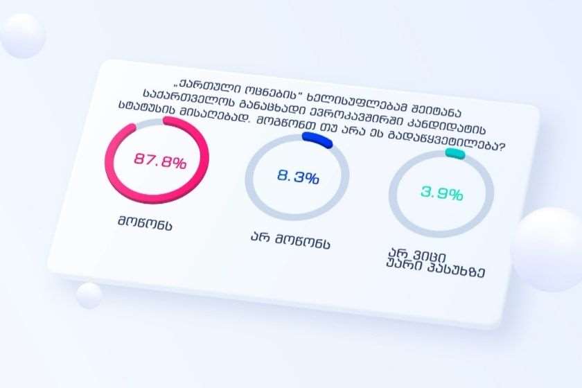 GORBI: რესპონდენტთან 87,8%-ს მოსწონს „ქართული ოცნების“ ხელისუფლების მიერ საქართველოს განაცხადი ევროკავშირში კანდიდატის სტატუსის მისაღებად