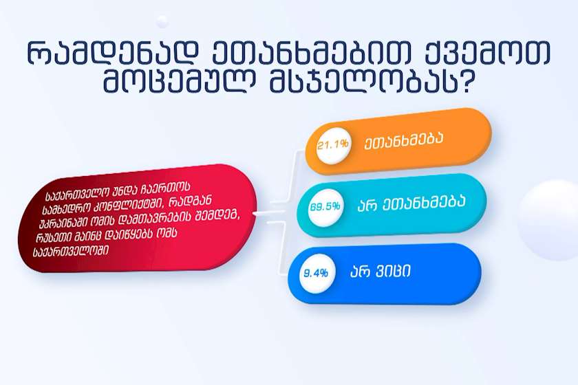 GORBI-ს კვლევის მიხედვით, მსჯელობას, რომ საქართველო უნდა ჩაერთოს სამხედრო კონფლიქტში, რადგან უკრაინაში ომის დამთავრების შემდეგ, რუსეთი მაინც დაიწყებს ომს საქართველოში - ეთანხმება გამოკითხულთა მხოლოდ 21,1%, არ ეთანხმება 69,5% და 9,4% პასუხობს რომ არ იცის.
