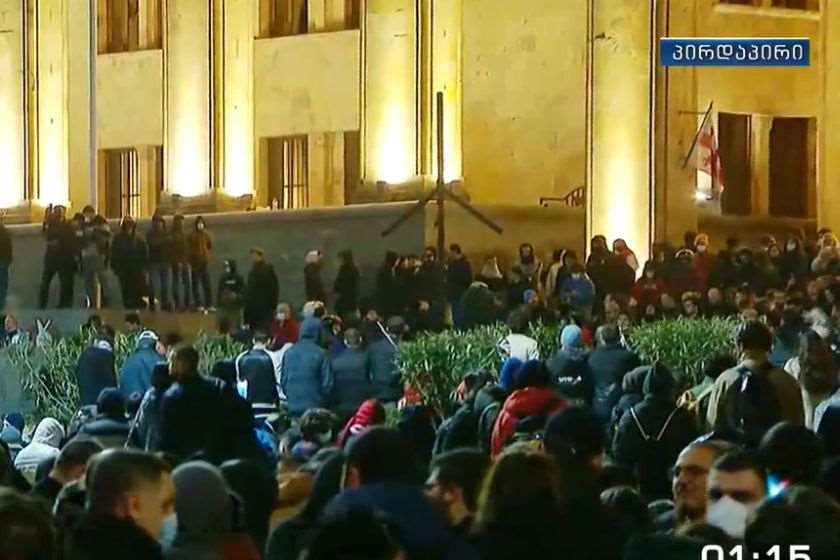 პარლამენტთან აქცია გრძელდება. ამ წუთებში ოპოზიციის ლიდერები სიტყვით გამოდიან.