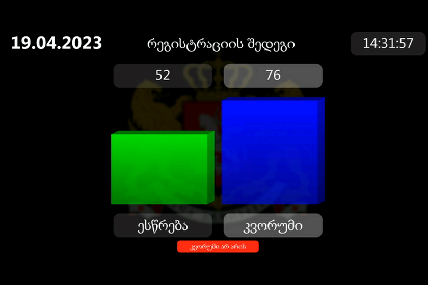 გუშინდელ სესიაზე, კვორუმის არარსებობის გამო, კენჭისყრა ვერ შედგა. ამის მიზეზი მმართველი გუნდის პოლიტიკური გადაწყვეტილება იყო. სასამართლო ხელისუფლების სოლიდარობის ნიშნად, ქართულ ოცნებას რეგისტრაცია არ გაუვლია. სხდომაზე რეგისტრაცია გაიარა მხოლოდ 51-მა დეპუტატმა, რაც კვორუმისთვის საკმარისი არ არის.