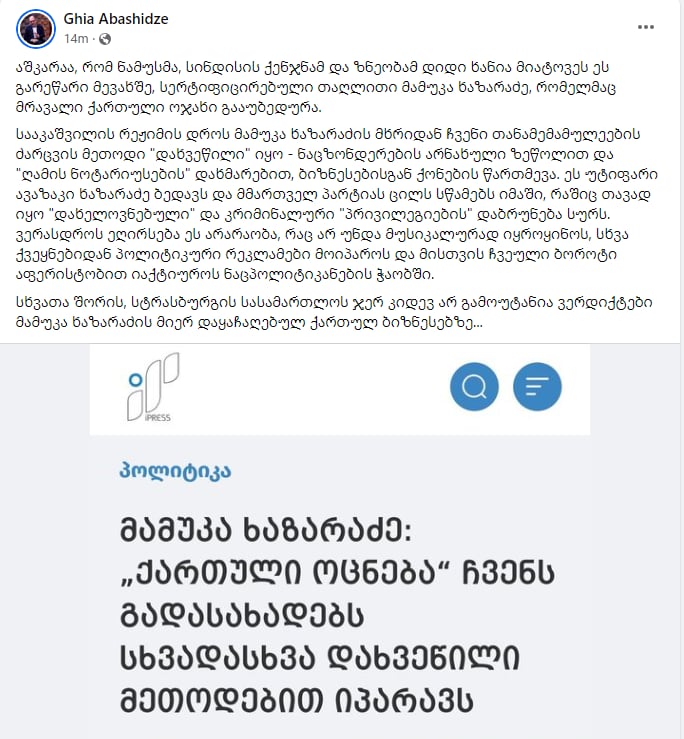 სხვათა შორის, სტრასბურგის სასამართლოს ჯერ კიდევ არ გამოუტანია ვერდიქტები მამუკა ხაზარაძის მიერ დაყაჩაღებულ ქართულ ბიზნესებზე...“-წერს გია აბაშიძე სოციალურ ქსელში.