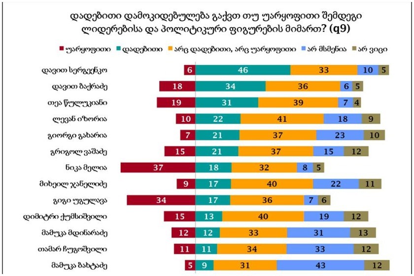 ბოლო ადგილზეა „ნაციონალური მოძრაობის“ წევრი ნიკა მელია: მას დადებითად 18%, უარყოფითი 37% აფასებს.