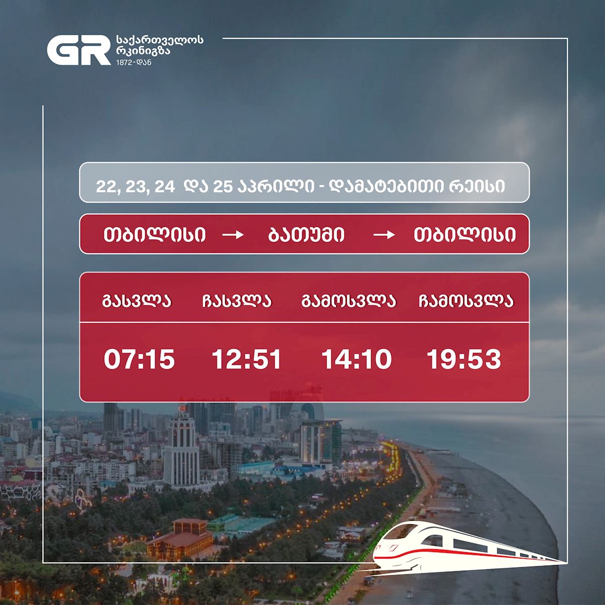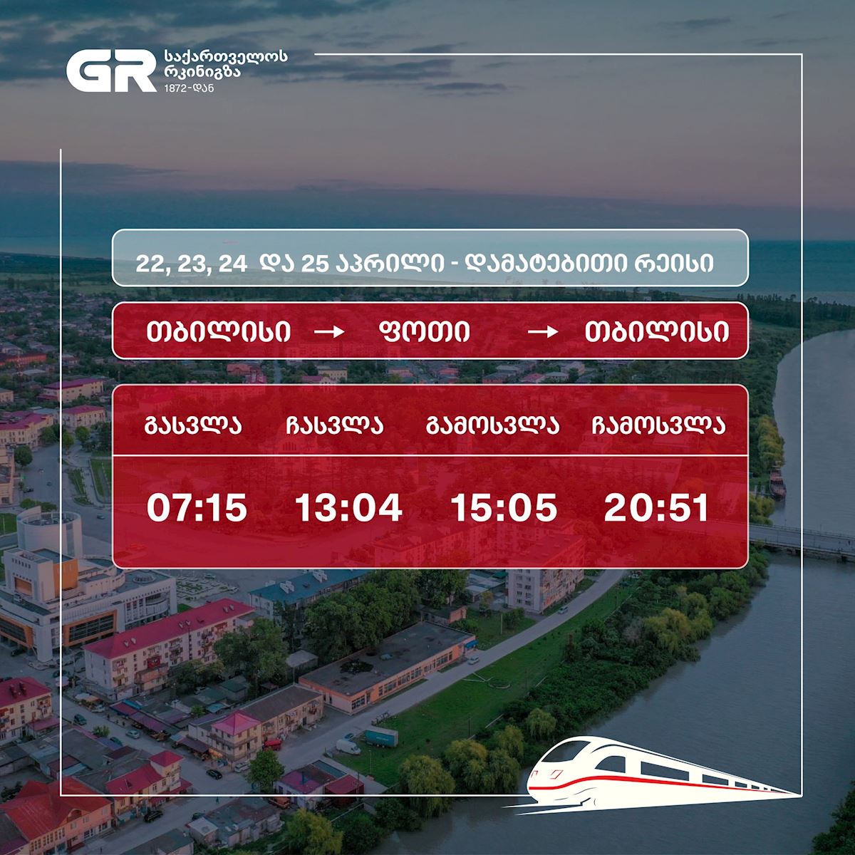 22, 23, 24 და 25 აპრილს თბილისი-ბათუმისა და 21,22,23,24 და 25 აპრილს თბილისი-ფოთის მიმართულებით საქართველოს რკინიგზა დამატებით რეისებს ნიშნავს.