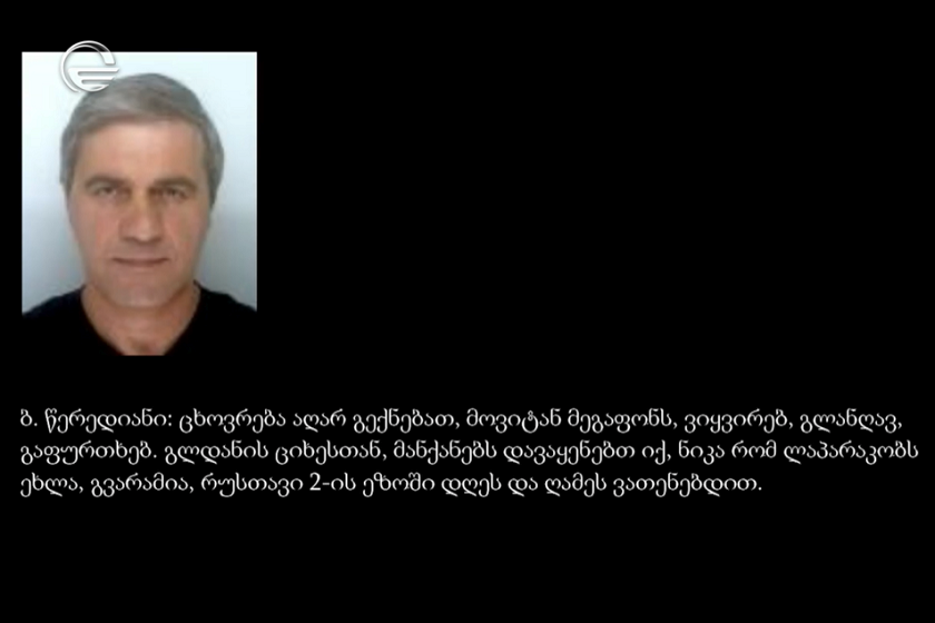 „ბ. წერედიანი: ჩვენ იცი რა უნდა გავაკეთოთო? არჩევნების დღესო კეთილი უნდა ვინებოთო, მე მეუბნება, კეთილი უნდა ინებოო, სახლში ყველას უნდა დაემშვიდობოო, მოხვიდეო და თუ საჭირო იქნებაო, თავიც გაატეხინოო... როგორც კი კიდევ ერთი აქცია იქნება ციხესთან, ეგრევე შევიკრიბებით, მივალთ ღარიბაშვილის სახლთან, გაფრთხილება უნდა იყოს ღარიბაშვილის და ჯანდაცვის მინისტრის და იუსტიციის მინისტრის, ეს სამი ლოკაცია უნდა იყოს. ციხეს ვერ აიღებ, ერთადერთი გზაა, ამას სჭირდება პარტიის რესურსი. გუშინ გვქონდა ამაზე საუბარი, მაგრამ არ ვიცი, როგორ გადაწყდება. ეს არის - მიიყვან მანქანებს, 100-150 მანქანა, მიიყვან, ჩაკეტავ. გლდანის ციხის ირგვლივ რაც არის გზები, უბრალოდ, მანქანებით უნდა ჩახერგო. ერთი 500-600 კაცი სჭირდება მობილიზებული, ვერ იზამენ ვერაფერს. როგორც კი დასჭირდება გადაყვანა, მერე გადაიყვანენ კლინიკაში. მე დარწმუნებული ვარ ამაში, რომ ჩვენ მაინც მაიდანი მოგვიწევს ბოლოს... იმიტომ, რომ ესენი არჩევნებით არსად არ წავლენ, თუ არ ჩამოიშალა სისტემა, მაგრამ აქამდე უნდა მიიყვანო პროცესი. ამათ იმდენად საზიზღარი მეთოდებით მოუწევთ მეორე ტურის გაყალბება, რომ ჩვენ ქუჩაში მოგვიწევს გამოვარდნა. ჩვენ რომ ქუჩაში გავალთ, რომ წავა ეს პროცესები, ამის მართვა შეუძლებელია წვრილმანების დონეზე, თორემ გლობალურად შეიძლება მართო პროცესი ქუჩაში, მაგრამ წვრილმანებში ვერ მართავ და იქ ერთი ადამიანი, ორი და სამი ადამიანი დაზიანდება. მერე უკვე პროცესი წავა უმართავი. ჩვენ ყველაფერი გავაკეთეთ 30-სთვის, ეს ადამიანი დათმობას არ აპირებს და ჩვენ მართლები ვიქნებით ყველასთან, ეს ორი ამოცანა გვაქვს. ეხლა მინდოდა... მზად ვართ ამისთვის, რომ დღეს კი არ მივუვარდეთ ღარიბაშვილს, უბრალოდ, გამოვიდეთ, დავდგეთ და ვუთხრათ, რომ კიდევ ერთი კონტრაქცია იქნება, ასეთი ნაგვის, რომელიც იქ არის და შენს სახლთან 11 საათამდე რომ მოვალთ 5 საათზე, არც შენ, არც შენს ცოლ-შვილს და არც შენს სამეზობლოს ცხოვრება აღარ გექნებათ. მოვიტან მეგაფონს, ვიყვირებ, გლანძღავ, გაფურთხებ, გლდანის ციხესთან, მანქანებს დავაყენებთ იქ, ნიკა რომ ლაპარაკობს ეხლა, გვარამია, რუსთავი ორის ეზოში დღეს და ღამეს ვათენებდით. მელიას ნაცების ოფისში რომ ვიჯექით დღე და ღამე, იქ ვერ დავჯდებით მანქანაში 2-3 დღე? პარტიამ ეს უნდა გადაწყვიტოს. 70 000 კაცი რომ გვედგა იქ, ვეუბნებოდი, რომ ხვალამდე მივცეთ ულტიმატუმი, თუ არა და კანცელარიას მივადგეთ, ჰა 70 000 კაციო, ჰა მიკროფონიო და მართეო მითხრა და პასუხისმგებელი შედეგებზე შენ იყავიო. იმ 70 000 კაციდან 7000 ხო მაინც დარჩებოდა ჩემნაირი გიჟი. ხო მაგრამ ახლა უყუ
