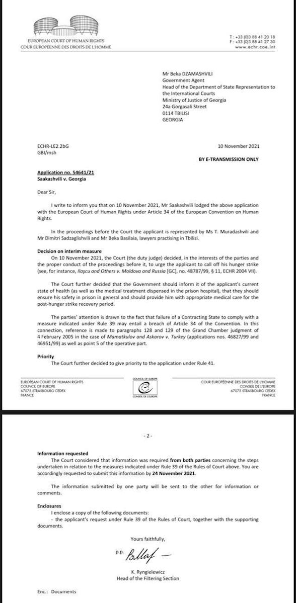 „საქართველოს მთავრობას სტრასბურგის სასამართლოს 2021 წლის 10 ნოემბრის წერილით ეცნობა, რომ ამავე თარიღში მიხეილ სააკაშვილის წარმომადგენლებმა მიმართეს ადამიანის უფლებათა ევროპულ სასამართლოს შემდეგი მოთხოვნით: დაუყოვნებლივ მოხდეს მიხეილ სააკაშვილის გადაყვანა №18 სამკურნალო დაწესებულებიდან (სადაც, მომჩივანი მხარის განმარტებით, არ არის სათანადოდ დაცული მისი ჯანმრთელობა და უსაფრთხოება) მრავალპროფილიან სამოქალაქო კლინიკაში.
