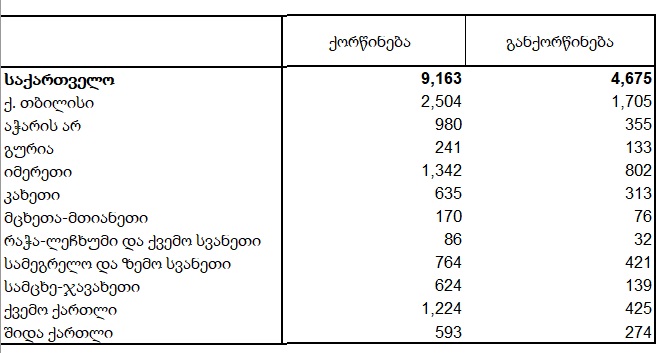 ქორწინების რაოდენობის თვალსაზრისით, თბილისი ლიდერობს. 6 თვეში, დედაქალაქში 2 504 ქორწინება დარეგისტრირდა. ყველაზე დაბალი მაჩვენებელი (86) რაჭა-ლეჩხუმისა და ქვემო სვანეთის რეგიონში დაფიქსირდა.