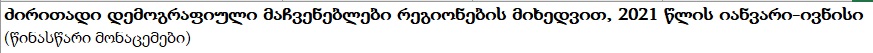 სტატისტიკის ეროვნული სამსახურის წინასწარი მონაცემებით, 2021 წლის იანვრიდან ივნისის ჩათვლით, საქართველოში 9 163 ქორწინება და 4 675 განქორწინება დარეგისტრირდა.