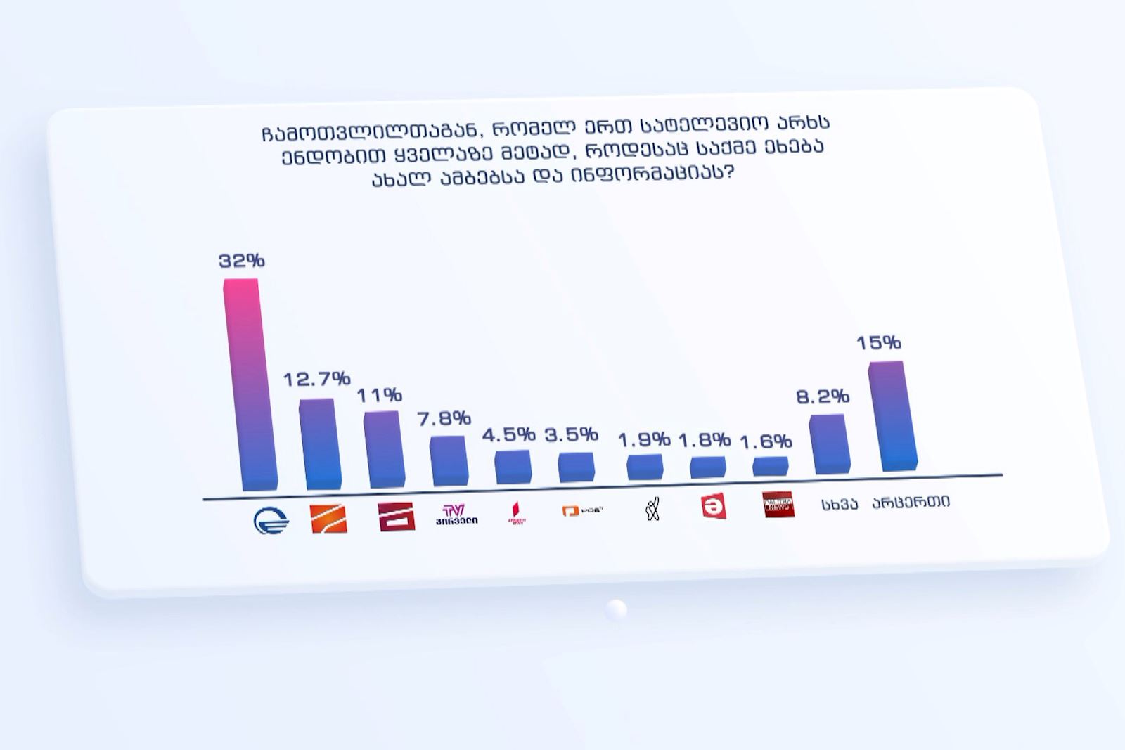 კითხვაზე „რომელ სატელევიზიო არხს ენდობით ყველაზე მეტად, როდესაც საქმე ეხება ახალ ამბებსა და ინფორმაციას?“ პასუხები ასე გადანაწილდა.
