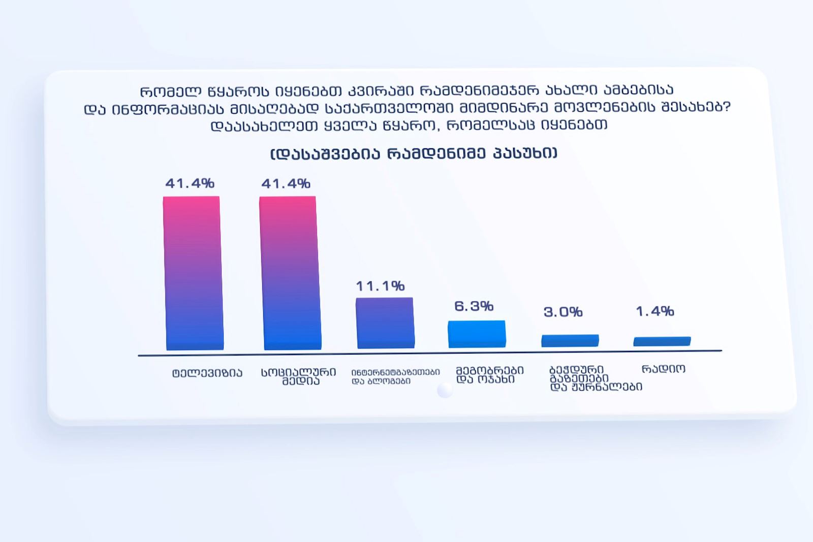 შეკითხვაზე „რომელ წყაროს იყენებთ კვირაში რამდენიმეჯერ ახალი ამბებისა და ინფორმაციის მისაღებად საქართველოში მიმდინარე მოვლენების შესახებ? დაასახელეთ ყველა წყარო, რომელსაც იყენებთ“ შედეგები ასე გადანაწილდა: ტელევიზია - 41,4%, სოციალური მედია - 41,4%, ინტერნეტგაზეთები და ბლოგები - 11,1%, მეგობრები და ოჯახი - 6,3%. ბეჭდური გაზეთები და ჟურნალები - 3%, რადიო - 1,4