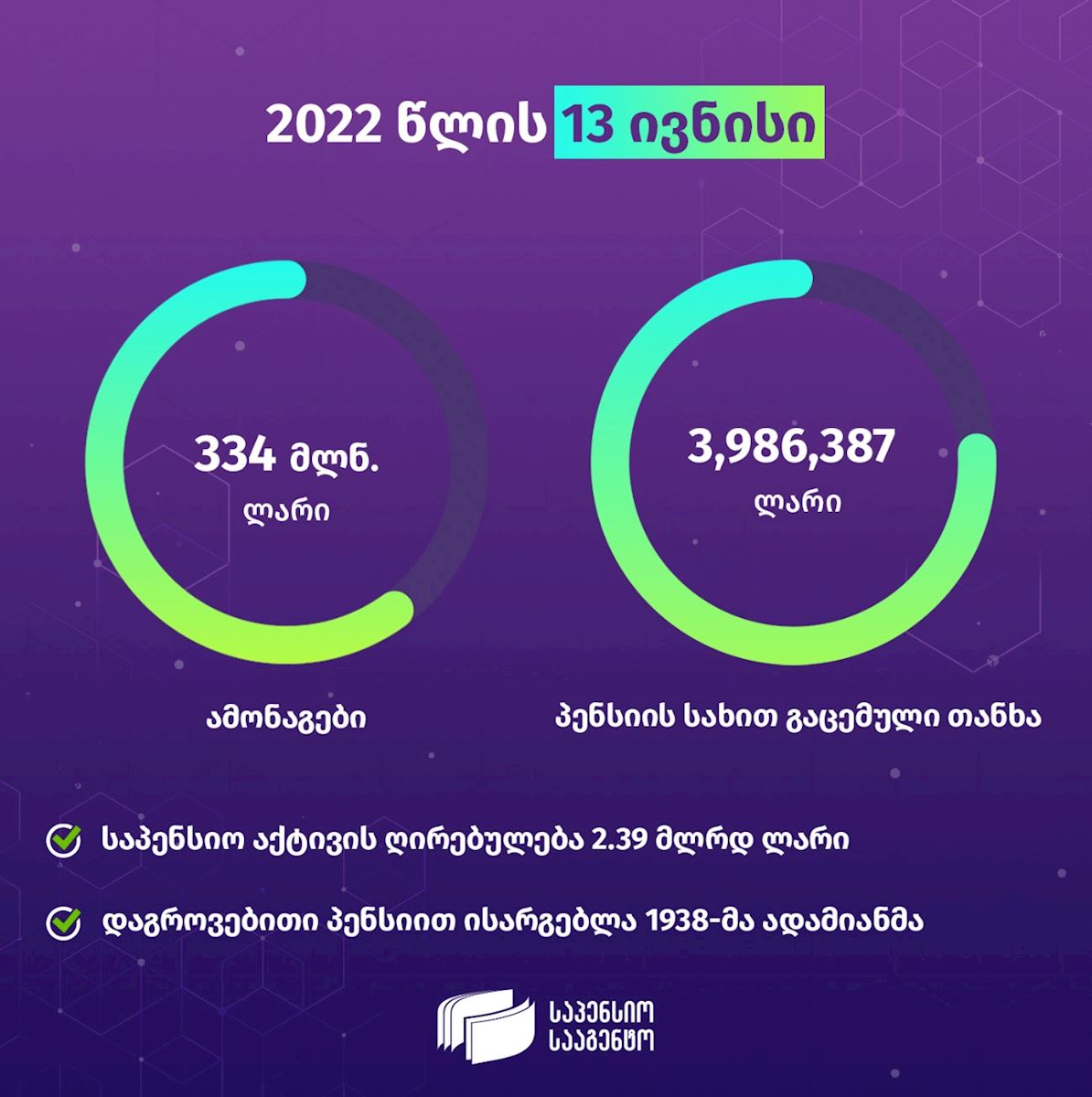 საპენსიო სააგენტო მიმდინარე წლის სტატისტიკას აქვეყნებს. სააგენტოს ცნობით, 13 ივნისის მდგომარეობით, მთლიანი საპენსიო აქტივების ღირებულება 2.39 მილიარდი ლარია, სარგებელი, კი 334 000 000 ლარს შეადგენს.