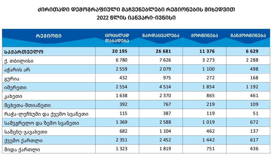 საქართველოში 2022 წლის იანვარ-ივნისში ცოცხლად დაბადებულთა რიცხოვნობამ 20 195 ბავშვი შეადგინა. ამავე პერიოდში ქვეყანაში გარდაიცვალა 26 681 ადამიანი. 2022 წლის პირველ ნახევარში ბუნებრივი მატება (სხვაობა ცოცხლად დაბადებულთა და გარდაცვლილთა რიცხოვნობას შორის) - 6 486 კაცით განისაზღვრა.