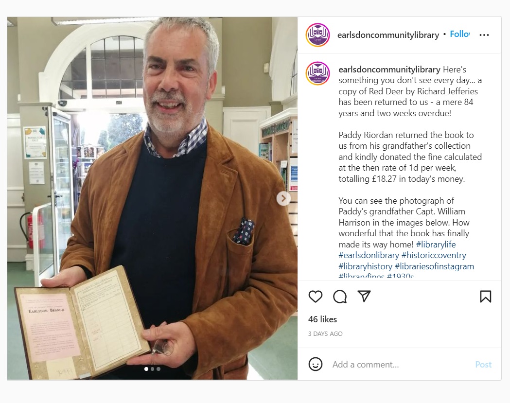 ბრიტანელმა კაცმა კოვენტრიში მდებარე ბიბლიოთეკას დაუბრუნა წიგნი (რიჩარდ ჯეფერისის „წითელი ირემი“), რომელიც მისმა ბაბუამ დაწესებულებიდან 1938 წელს გაიტანა.